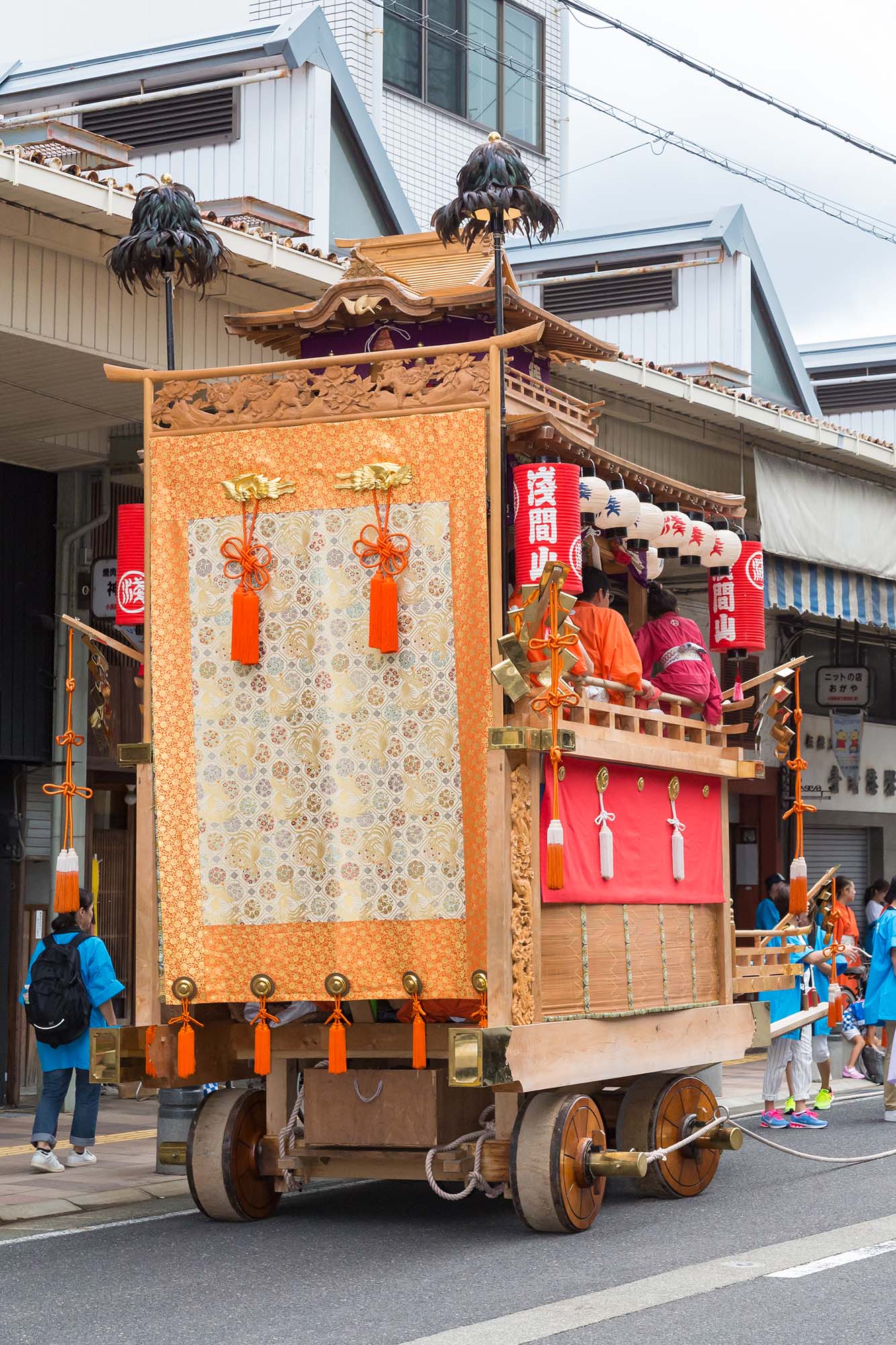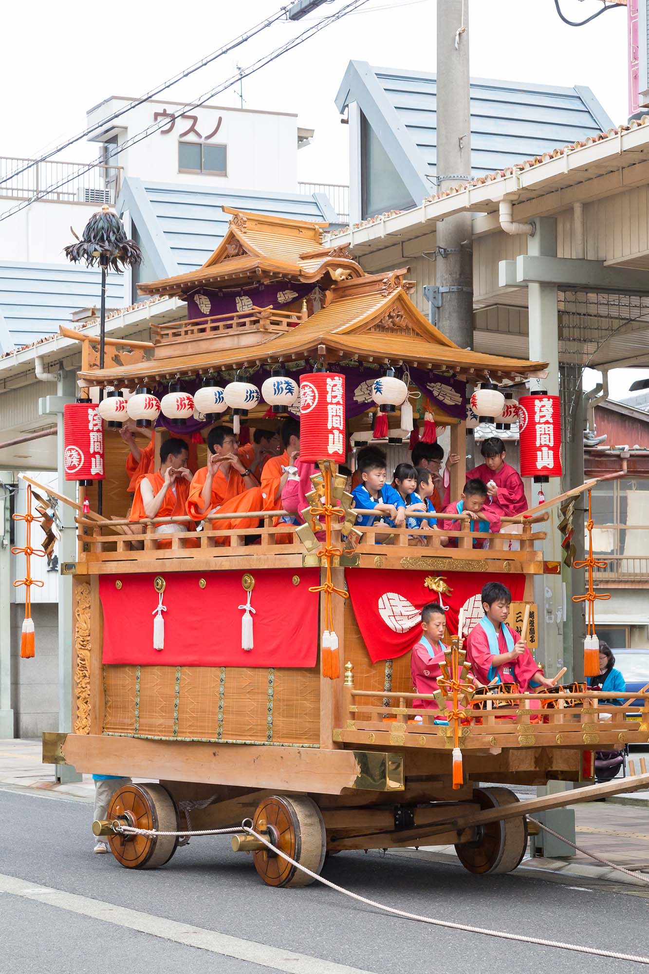 浅間区の「浅間山」は他区の山車とは異なり、笛や太鼓に加え摺鉦やジャンボン(銅拍子)を使い、長唄や端唄のメロディーを取り入れた囃子を演奏します。山車の容姿もまた独特の形状です。