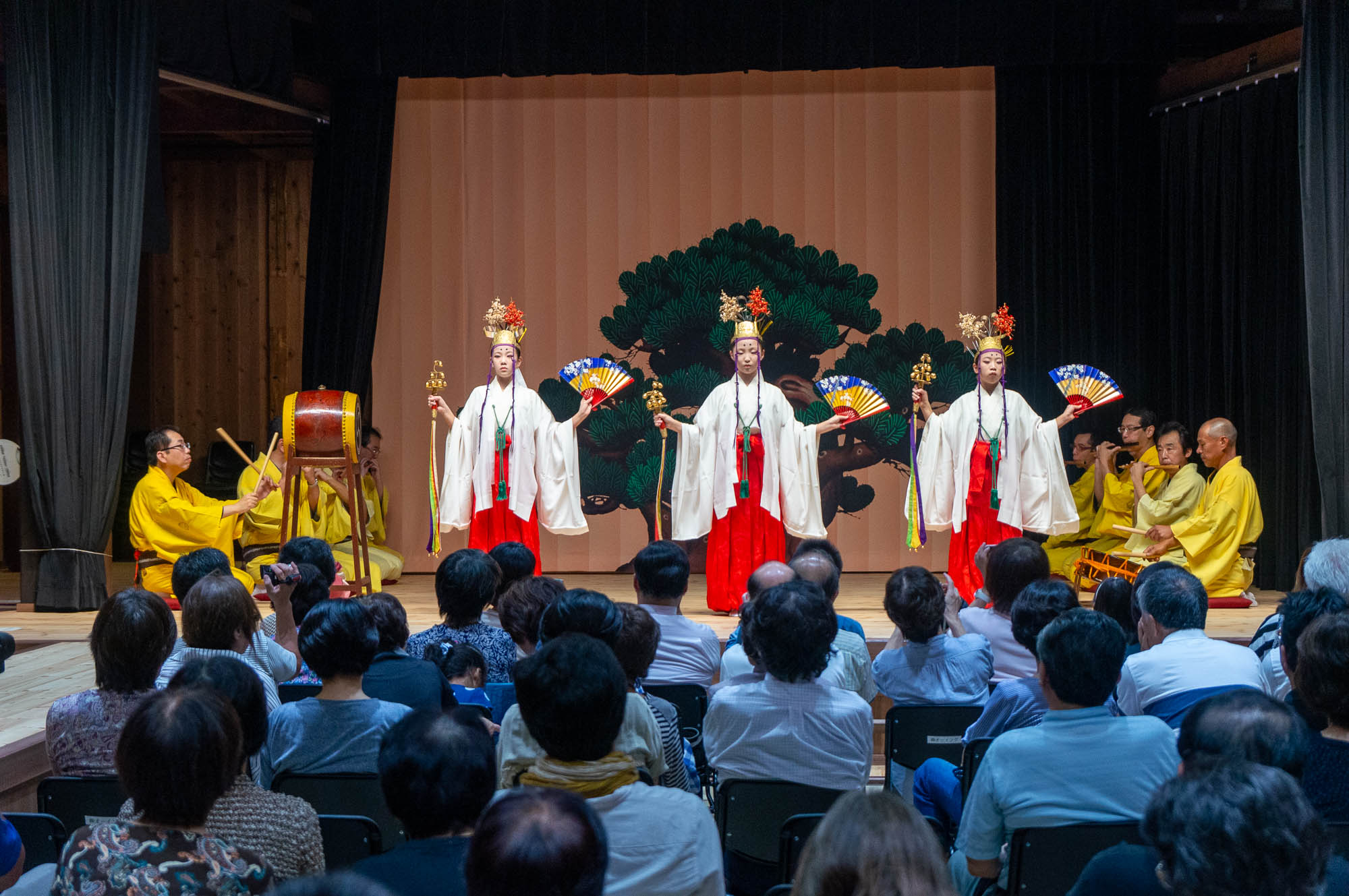 ▲ 八幡神社能舞台での白鬚区神楽舞の奉納