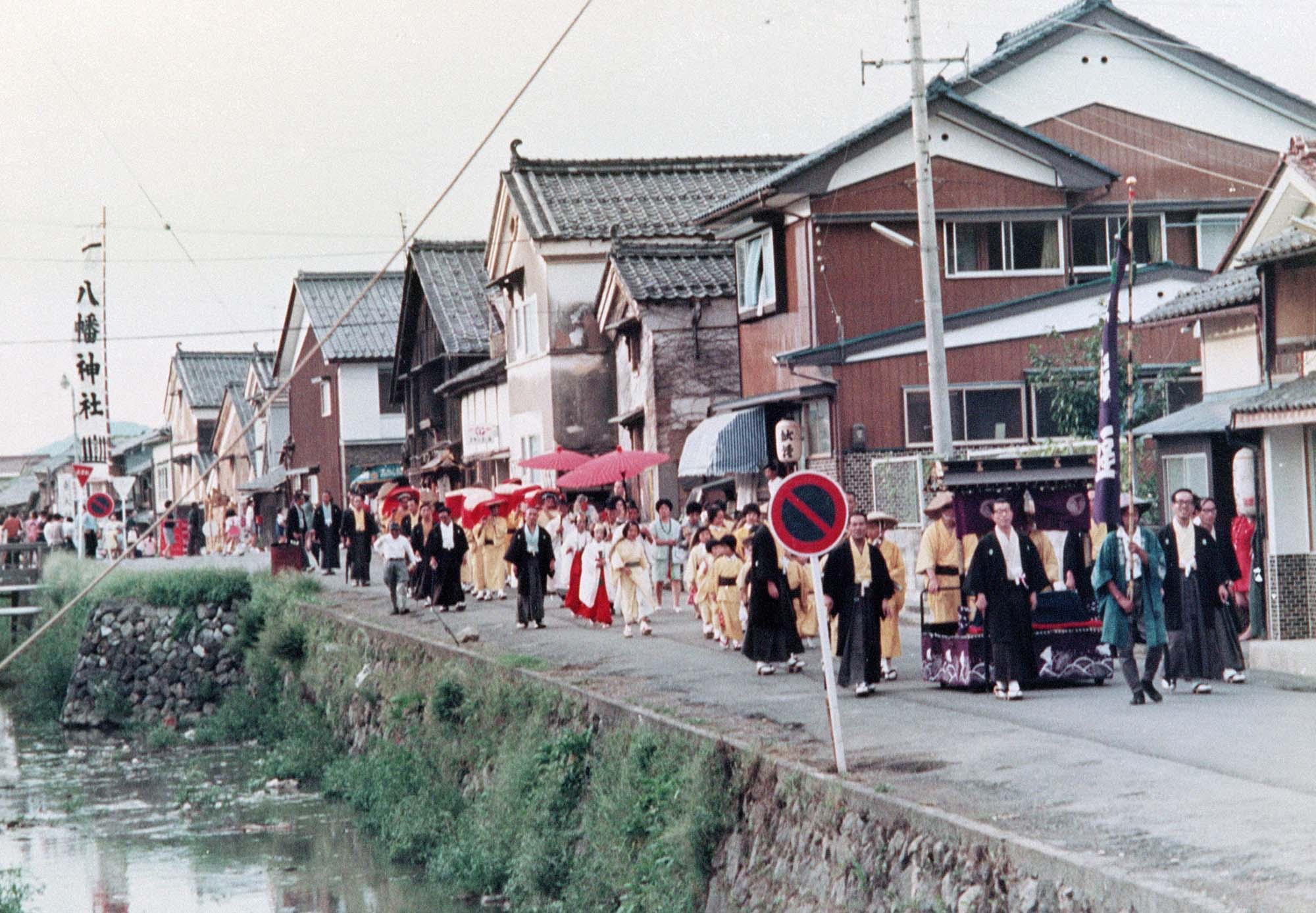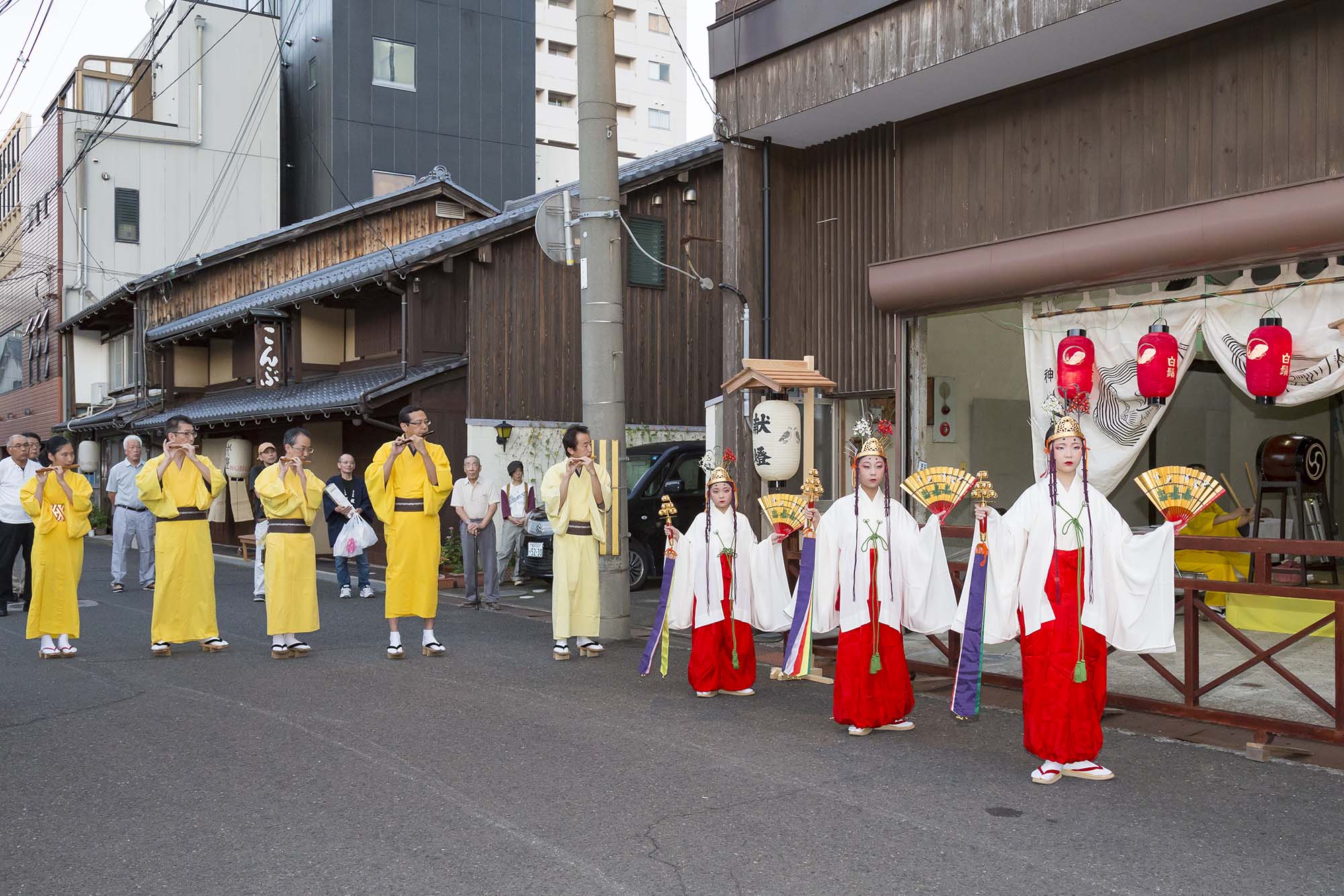 放生祭の5区のなかで唯一、神楽舞をともなう神楽です。神楽舞は、「お稚児さん」と呼ばれる巫女姿の3人の小学生女児が担当します。市街地再開発の影響で区の戸数が減ったため、昭和63(1988)年の出番を最後に巡行は休止していますが、神楽舞の奉納は継続しています。