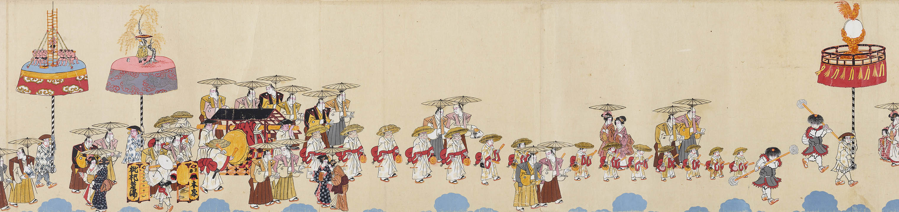 廣嶺神社が所蔵する江戸後期の絵巻物「小浜祇園祭礼図」(県指定文化財)には、行列の先頭を行く、傘鉾・棒振・大太鼓の一団と、さらにそれに続く傘鉾2本が描かれています。先頭の金鶏を載せた傘鉾は現在も住吉区に残っており、その収納箱には「傘鉾 上小路」「享和4(1804)年」の墨書があります。後ろの傘鉾2本が北本町が出していた「傘鉾」で、先頭の傘鉾と棒振から大太鼓の屋形までが鵜羽小路が出していた「大太鼓」かと思われます。これがほぼそのままのかたちで、現在の住吉区の大太鼓に引き継がれていることがわかります。