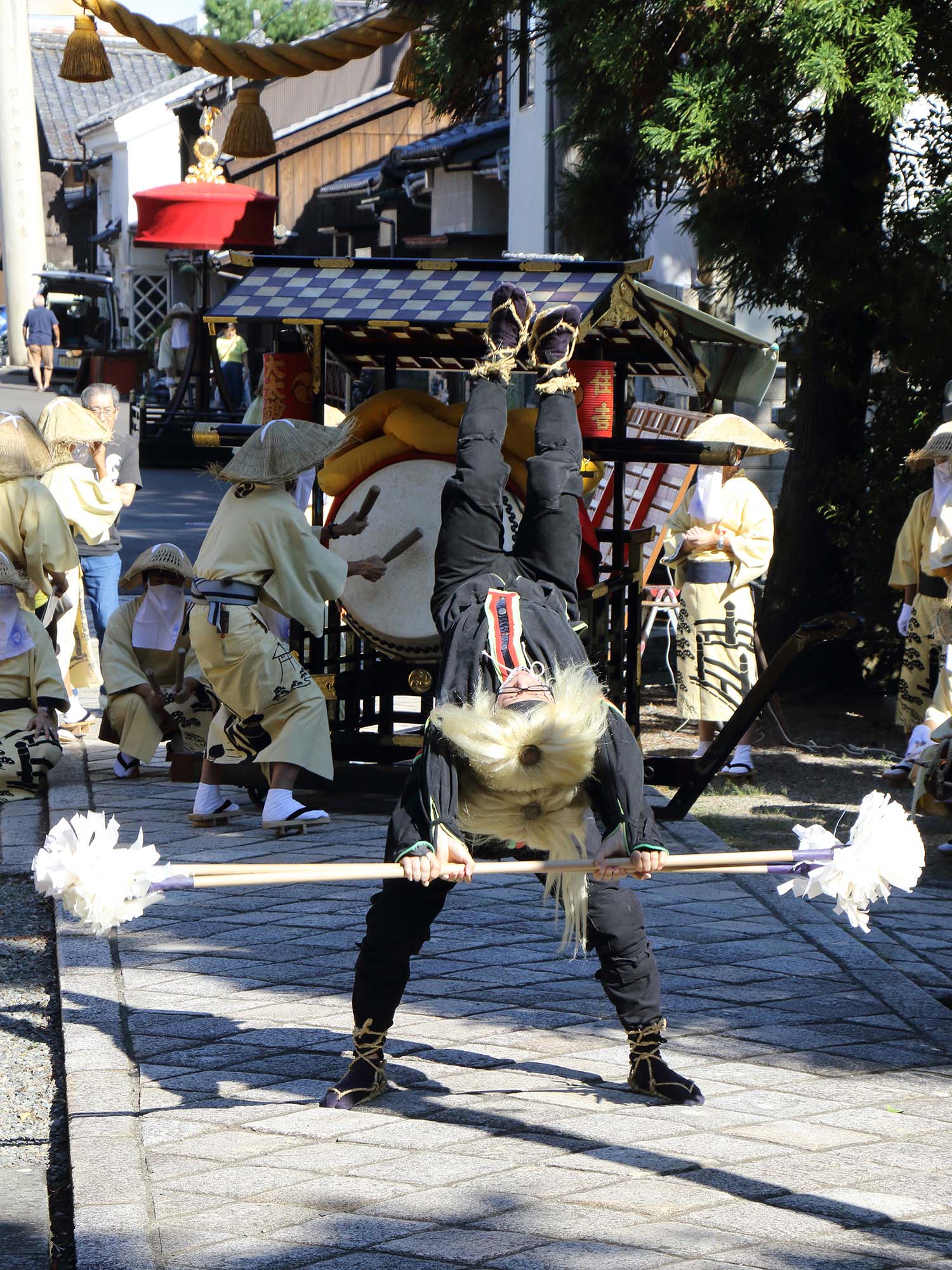 目的の場所まで来ると棒振二人は巴を描くように大きくその場所をまわり、やがて向かい合うと「攻め」の大太鼓が打ち止められます。ここまで棒振はずっと棒を水車のように回します。